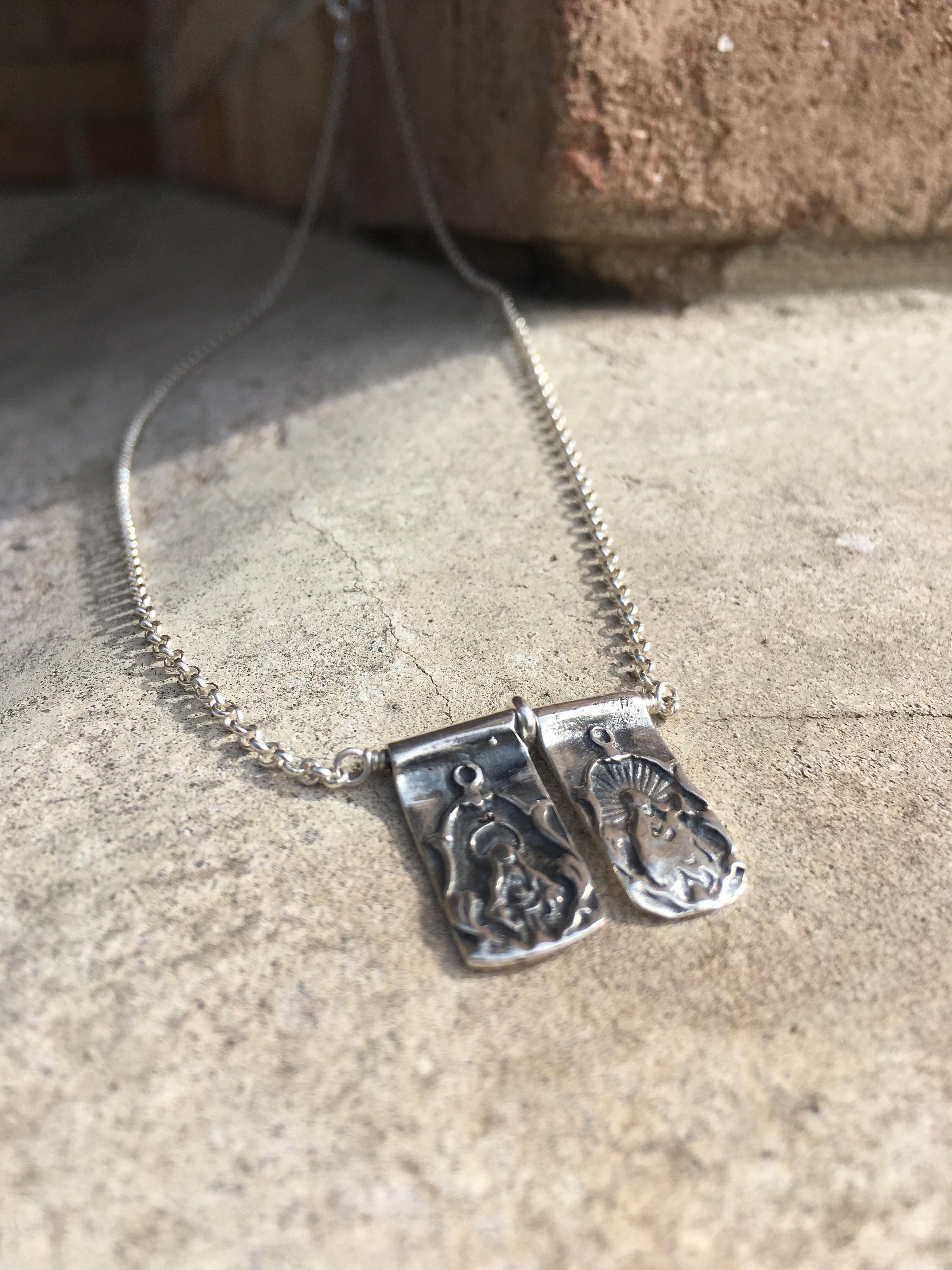 This is a vintage style two piece Catholic Scapular in Sterling silver. The set includes Our Lady of Mount Carmel and the Sacred Heart. You can have them set individually too.